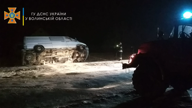 У Волинській області ввечері рятувальники допомогли водію вантажного буса, який перекинувся на дорозі. Також витягували й вантажне авто на Львівщині.