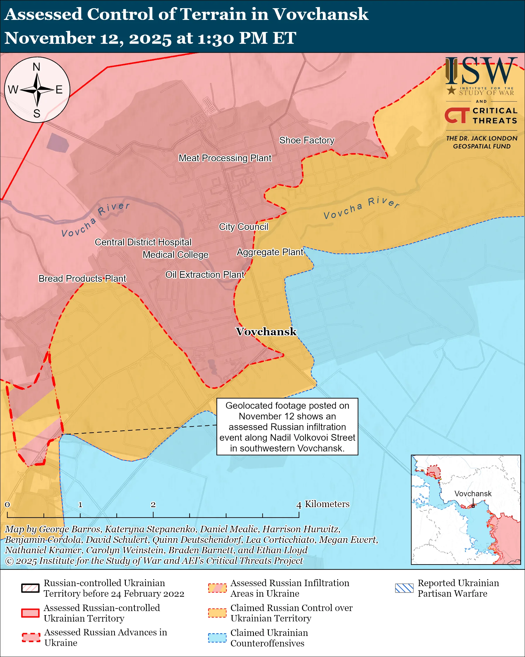 - Росіяни продовжили наступальні операції на напрямку Борової 12 листопада, але не просунулися вперед. Атаки були поблизу Богуславки, Борівської Андріївки, Надії, Греківки, Твердохлібового і в напрямку Новосергіївки 11 та 12 листопада.
