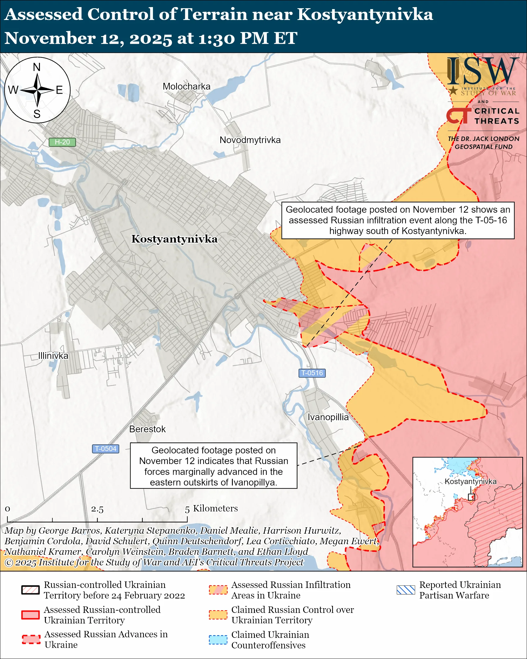 - Нещодавно російські війська незначно просунулися в тактичному районі Костянтинівка – Дружківка. Геолокаційні відеозаписи, опубліковані 12 листопада, свідчать про те, що вони мали успіхи на східній околиці Іванопілля. Також росіяни атакували поблизу самої Костянтинівки, Предтечиного, Білої Гори, Олександро-Шултиного, Щербинівки, Плещіївки, Іванопілля, Яблунівки, Русиного Яру, Софіївки та Володимирівки.