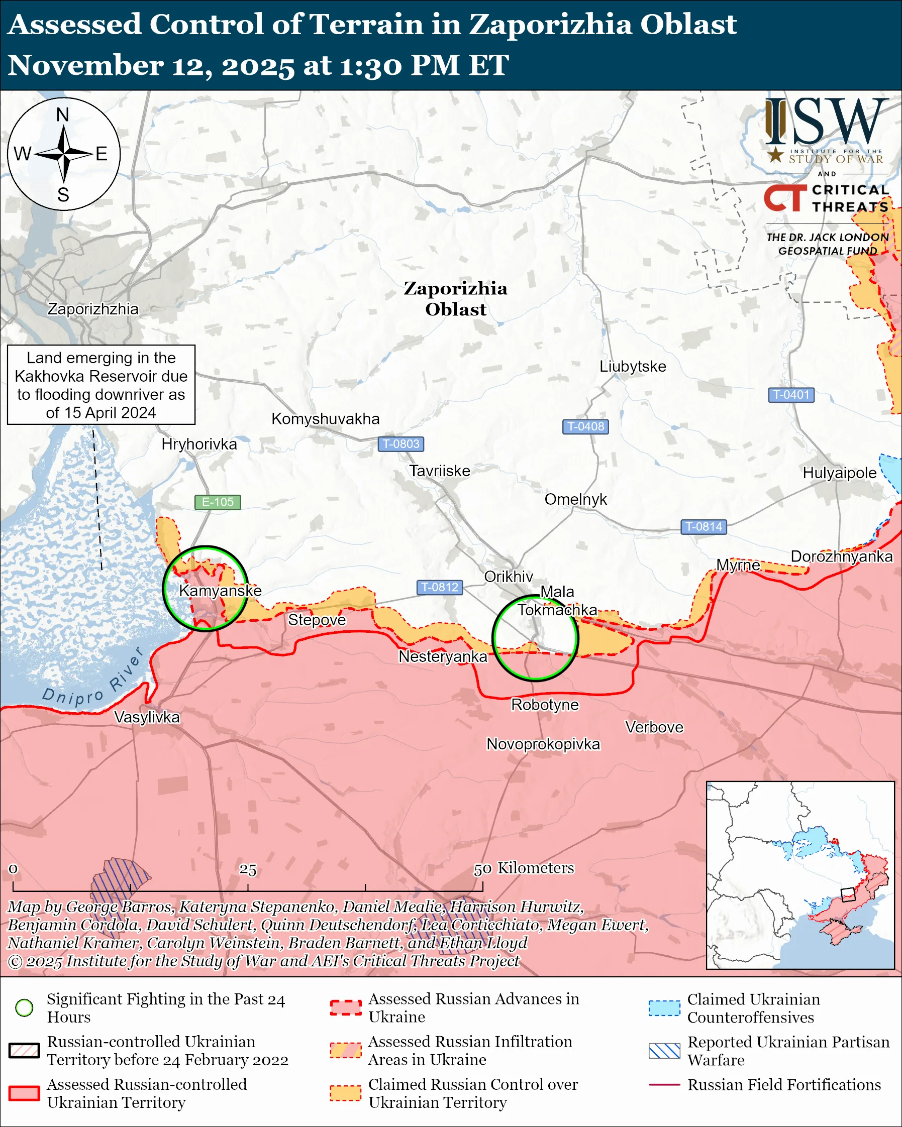 - Російські війська продовжили наступальні операції на заході Запорізької області, але не досягли підтвердженого просування. 11 та 12 листопада вони атакували поблизу Малої Токмачки, Новоданилівки, Степногірська та Приморського.