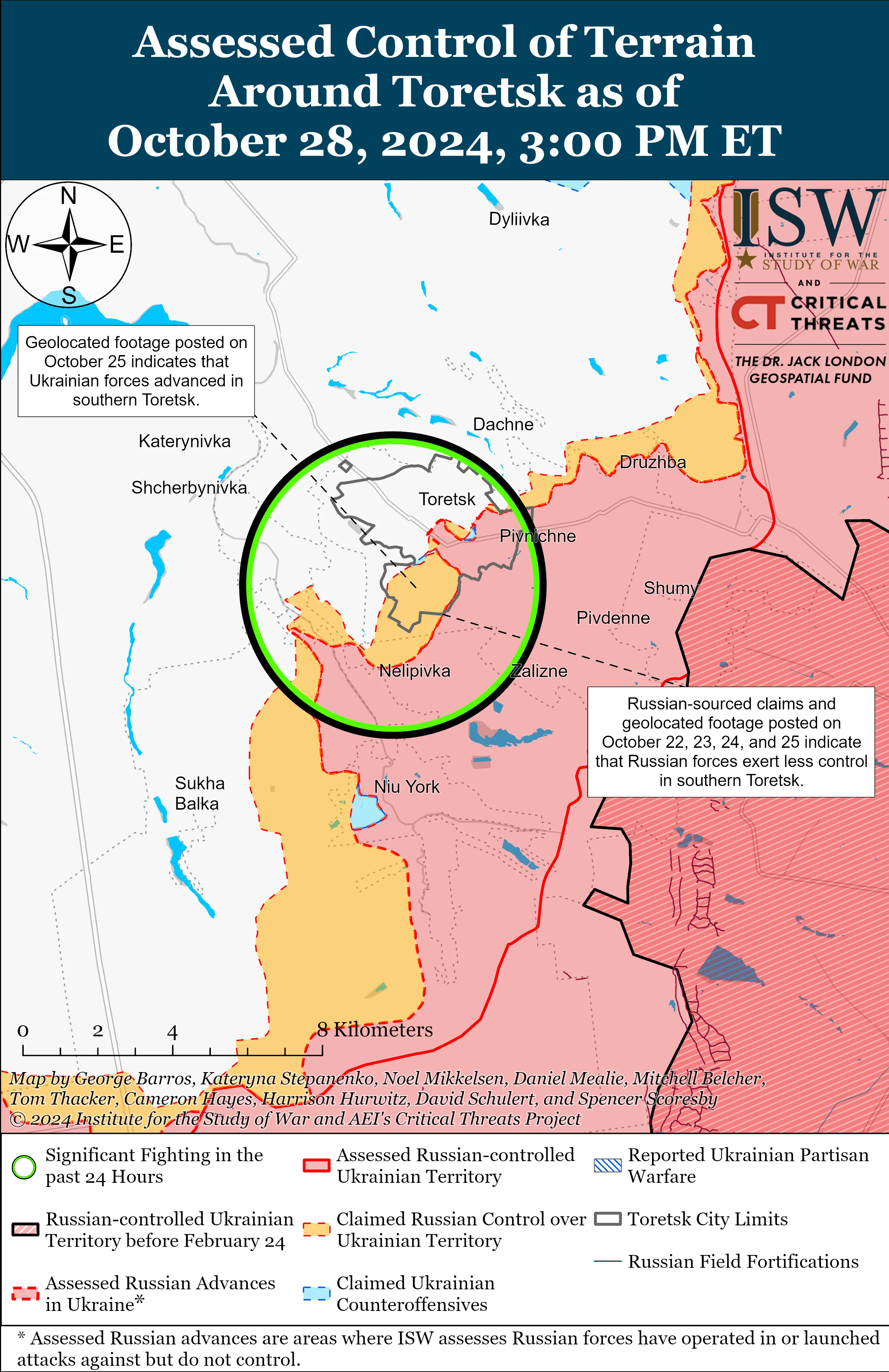 Інститут вивчення війни фіксує продовження наступу росіян у районі Торецька, хоча змін фронту так само зафіксовано не було. Один з російських воєнкорів 28 жовтня заявив про нібито просування ворога у центр міста, однак в ISW не знайшли цьому підтвердження. Того таки дня пропагандисти заявили, що українські сили контратакували на північ від вулиці Свердлова в Торецьку.