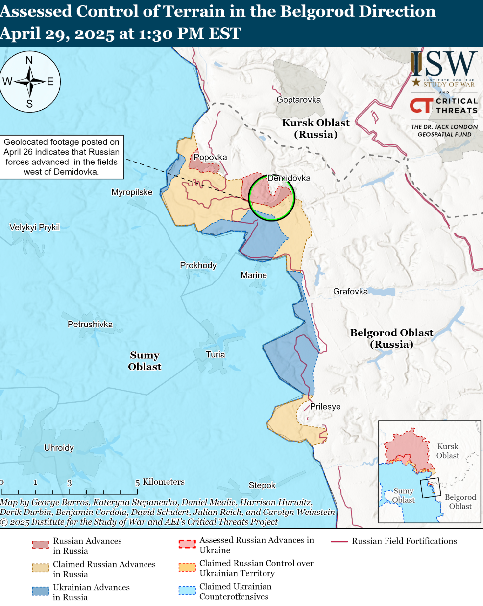 - Російські війська нещодавно просунулися в Бєлгородській області. Геолокаційні відеозаписи, опубліковані 26 квітня, свідчать про те, що окупанти просунулися в полях на захід від Демидівки.