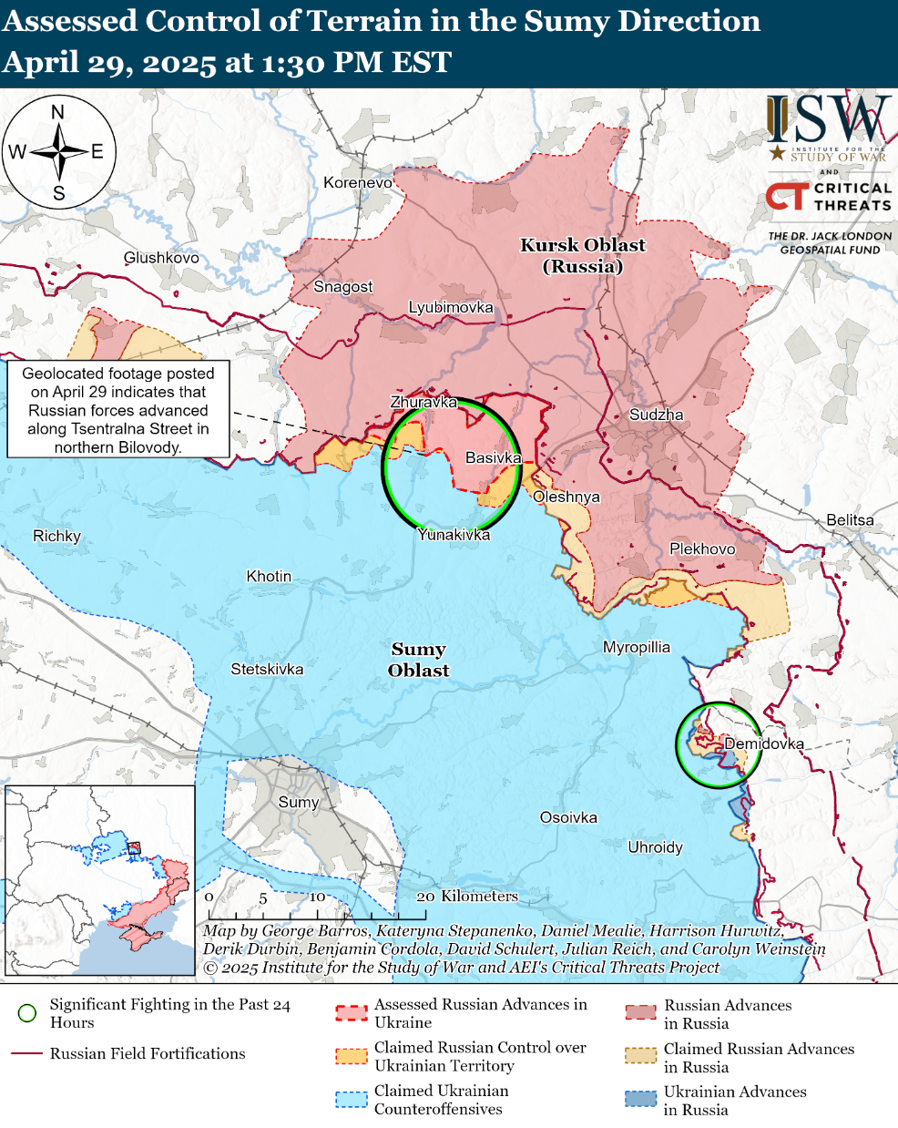 - Ворожі сили просунулися на півночі Сумської області. Відповідно до геолокаційних відеозаписів, опублікованих 29 квітня, російські війська нещодавно просунулися вздовж вулиці Центральної у північній частині Біловод (на північний схід від міста Суми).