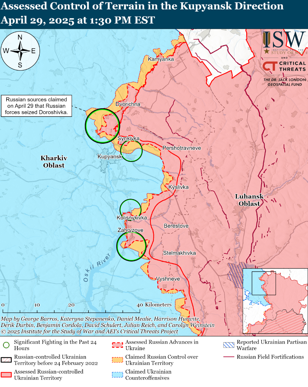 - Російські війська 28 і 29 квітня обмежили продовження наступальних операцій на Боровському напрямку, але не просунулися вперед.