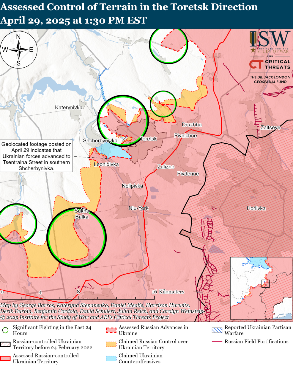 - Збройні Сили України нещодавно просунулися на Торецькому напрямку. Геолокаційні відеозаписи, опубліковані 29 квітня, свідчать про те, що українські війська просунулися вздовж вулиці Центральної на півдні Щербинівки (на захід від Торецька).