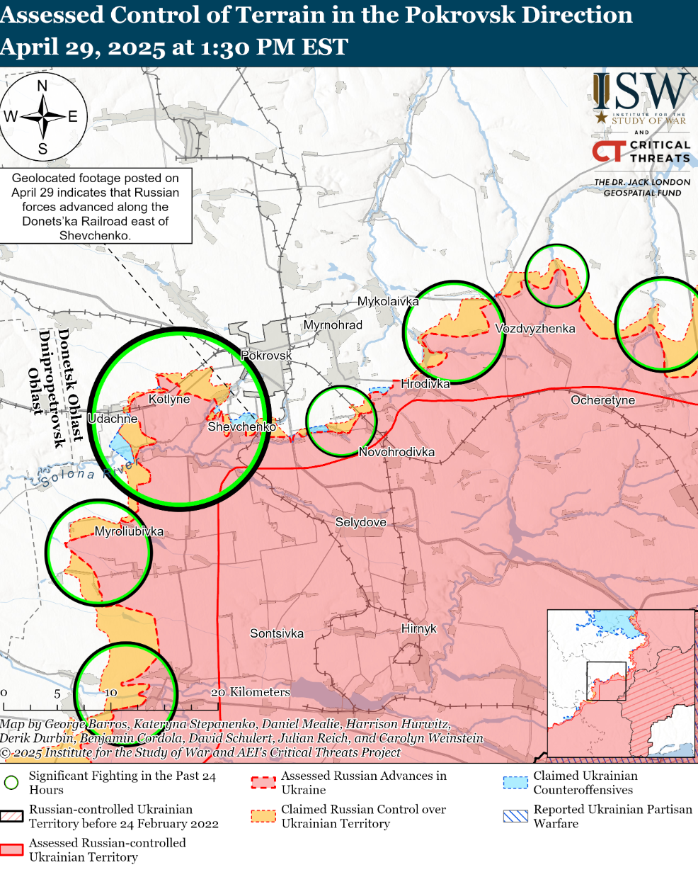 - Російські війська нещодавно просунулися на Покровському напрямку. Геолокаційні відеозаписи, опубліковані 29 квітня, свідчать про те, що загарбники просунулися вздовж залізничної колії на захід від Шевченка (на південь від Покровська).