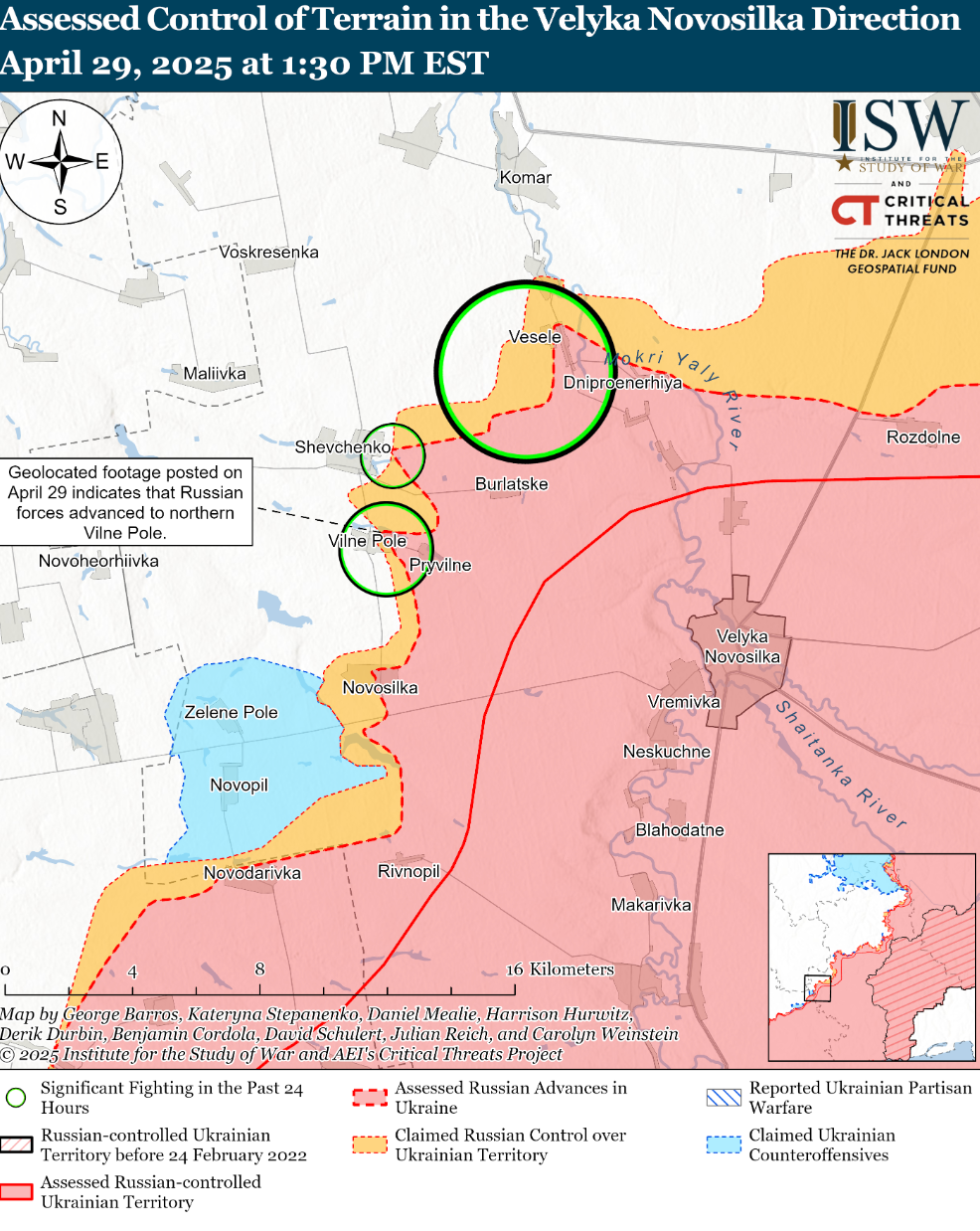 - Окупаційні сили просунулися на Курахівському напрямку. Геолокаційні відеозаписи, опубліковані 28 та 29 квітня, свідчать про те, що російські війська просунулися вздовж автомагістралі H-15 Курахове – місто Запоріжжя (на південний захід від Костянтинополя), на захід від Костянтинополя, а також на північ і північний захід від Розлива (на південний захід від Курахового).