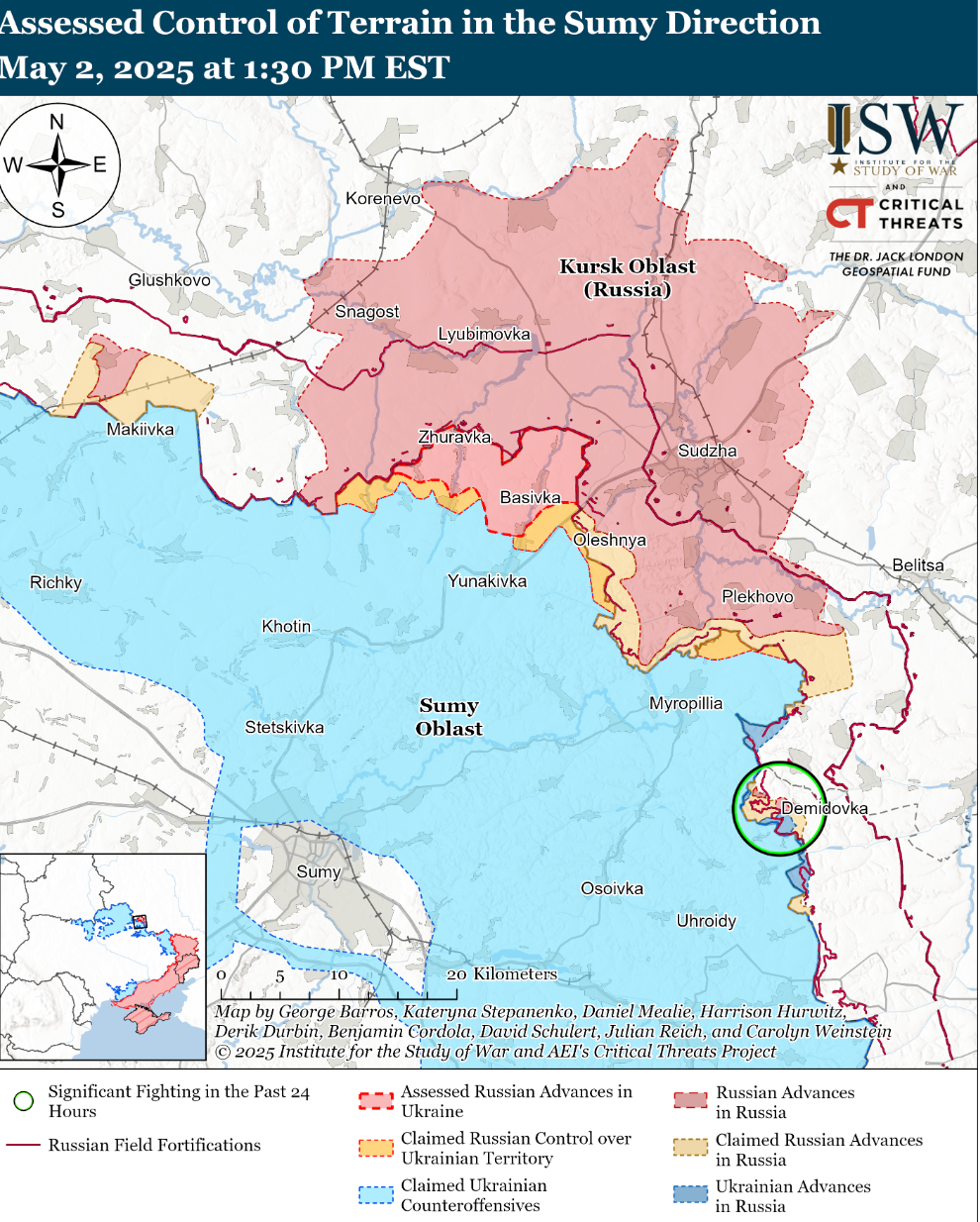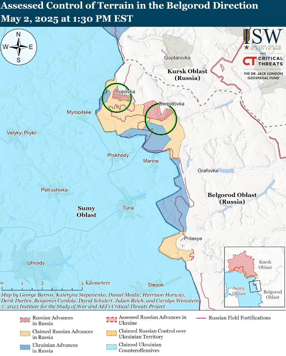 - 1 та 2 травня російські війська провели обмежені наступальні операції на Херсонському напрямку, але не просунулися вперед.