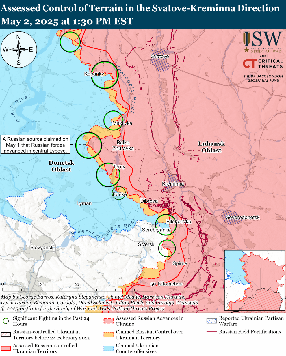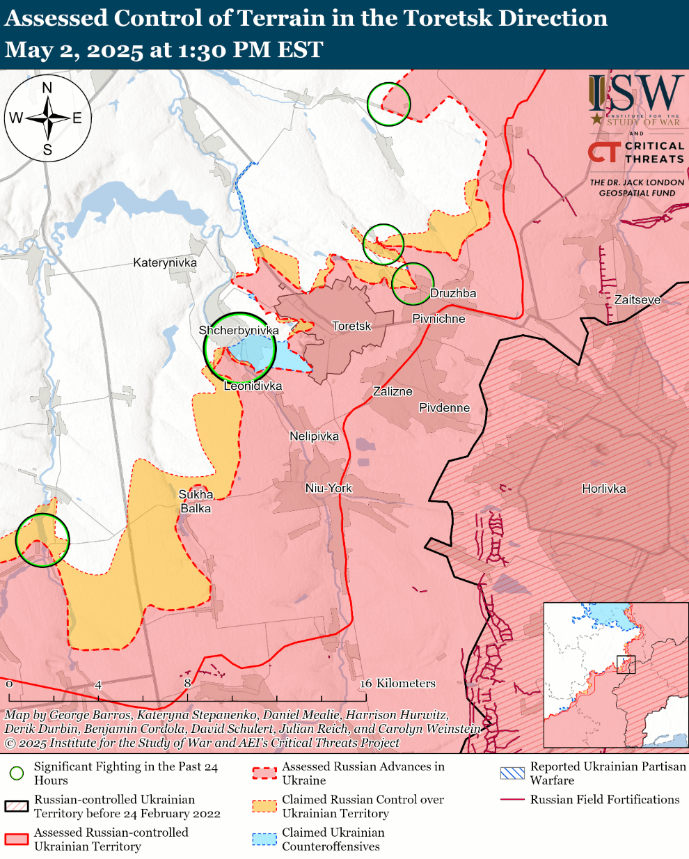 - Російські війська нещодавно просунулися на Торецькому напрямку, нарощуючи зусилля з просування вздовж і вгору по трасі Т-0504 Покровськ – Костянтинівка. Геолокаційні відеозаписи, опубліковані 1 травня, свідчать про те, що загарбники просунулися до Новооленівки (на південний захід від Торецька).
