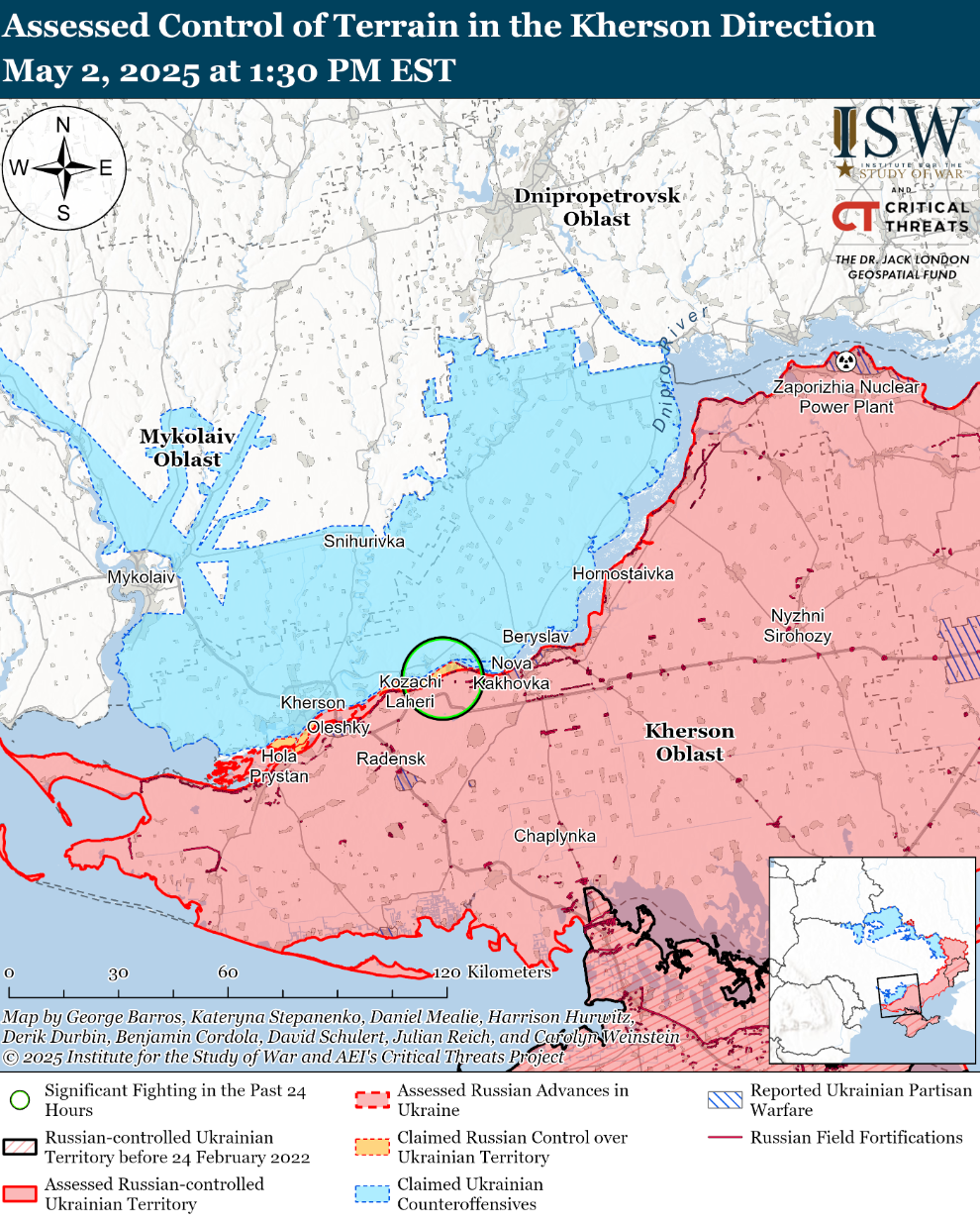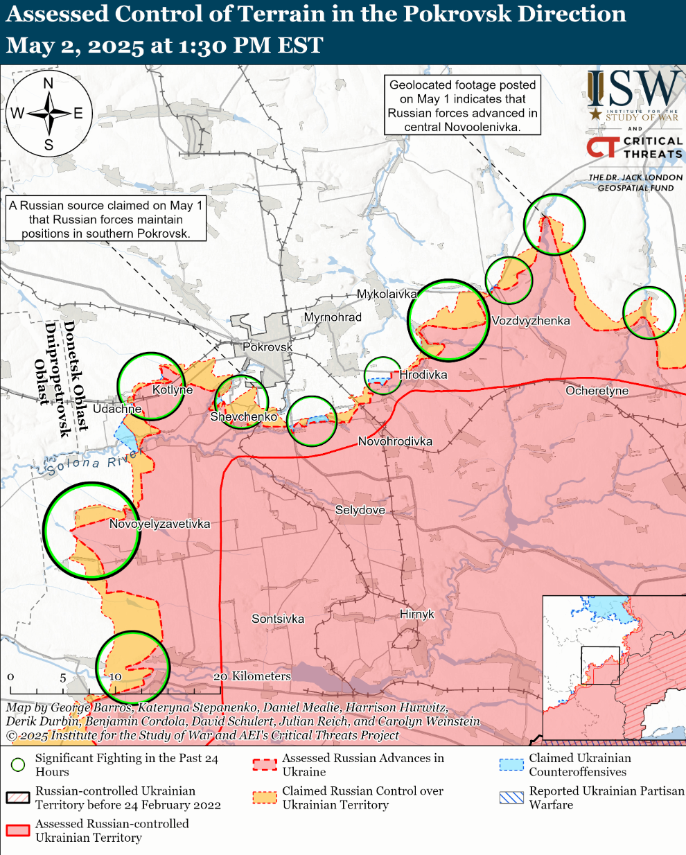 - Армія ворога також нещодавно просунулися на захід Запорізької області. Геолокаційні відеозаписи, опубліковані 27 квітня, свідчать про те, що російські війська нещодавно незначно просунулися на північний схід від Малих Щербаків (на захід від Оріхова).