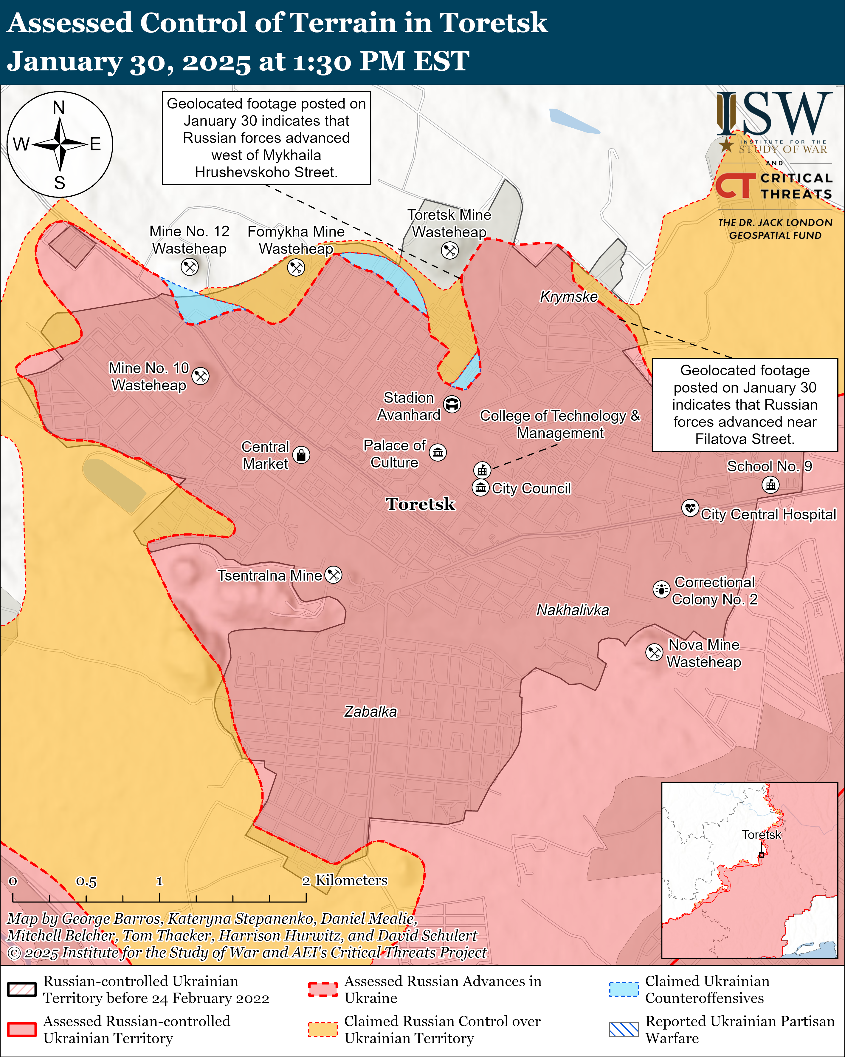 30 січня російські війська нещодавно просунулися в Торецьку. Війська ворога нещодавно просунулися в промислову зону на півночі Торецька, а також в районі Щербинівки.