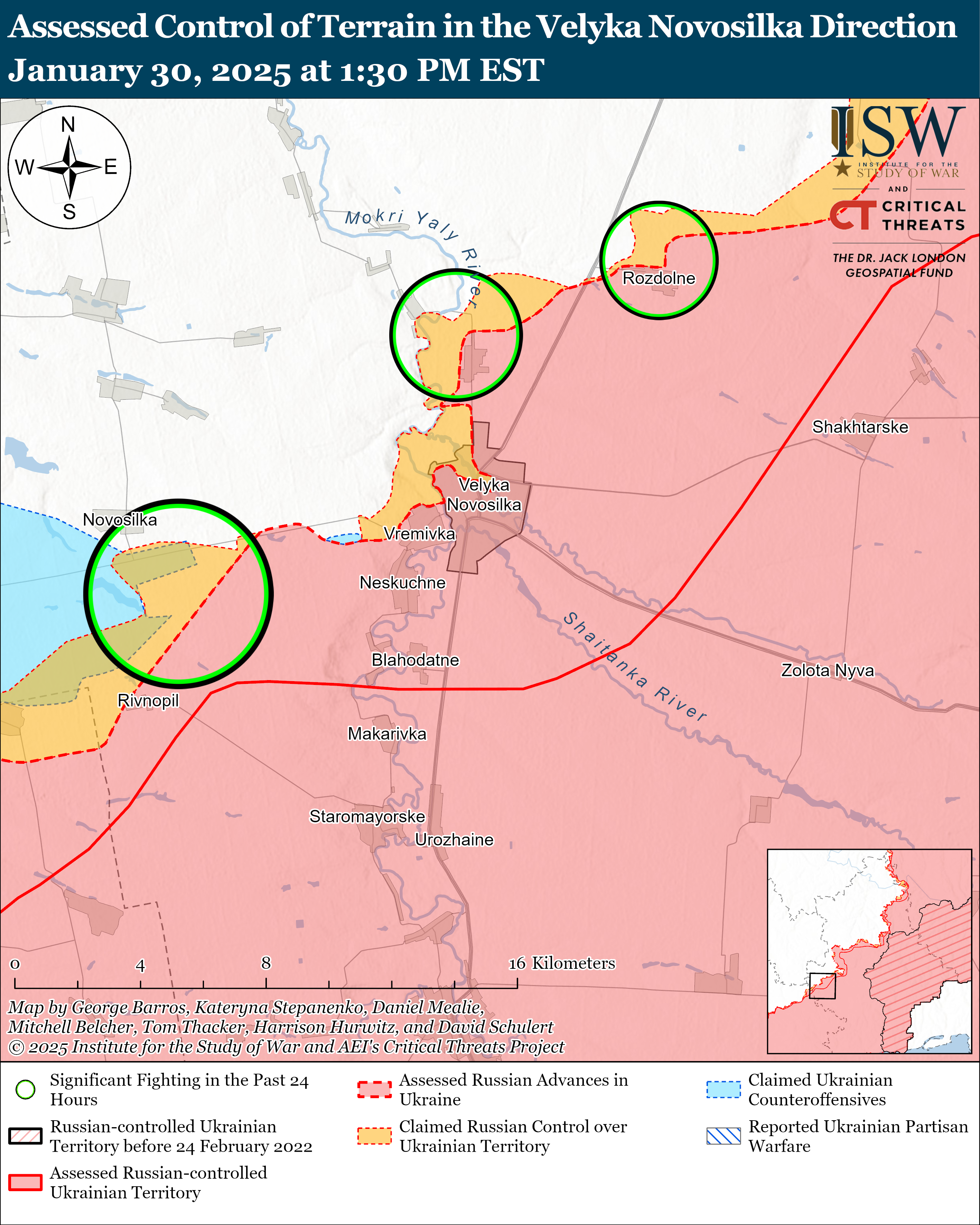 30 січня російські війська продовжували наступальні дії в районі Великої Новосілки, але не підтвердили наступ. Також ворога наступав на північний захід від Великої Новосілки поблизу Новоочеретуватого, біля Нових Комарів, біля Роздольного та біля Новосілки