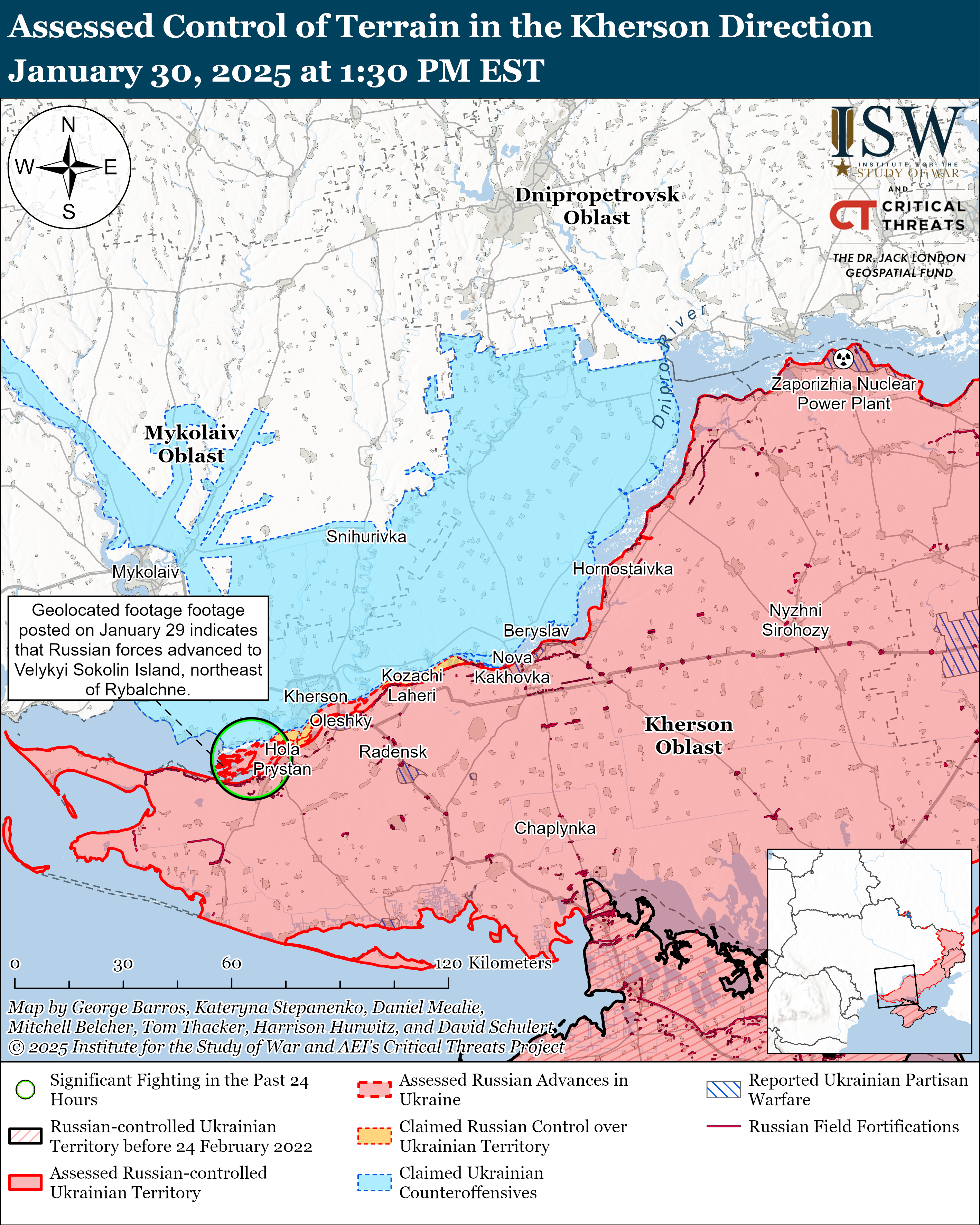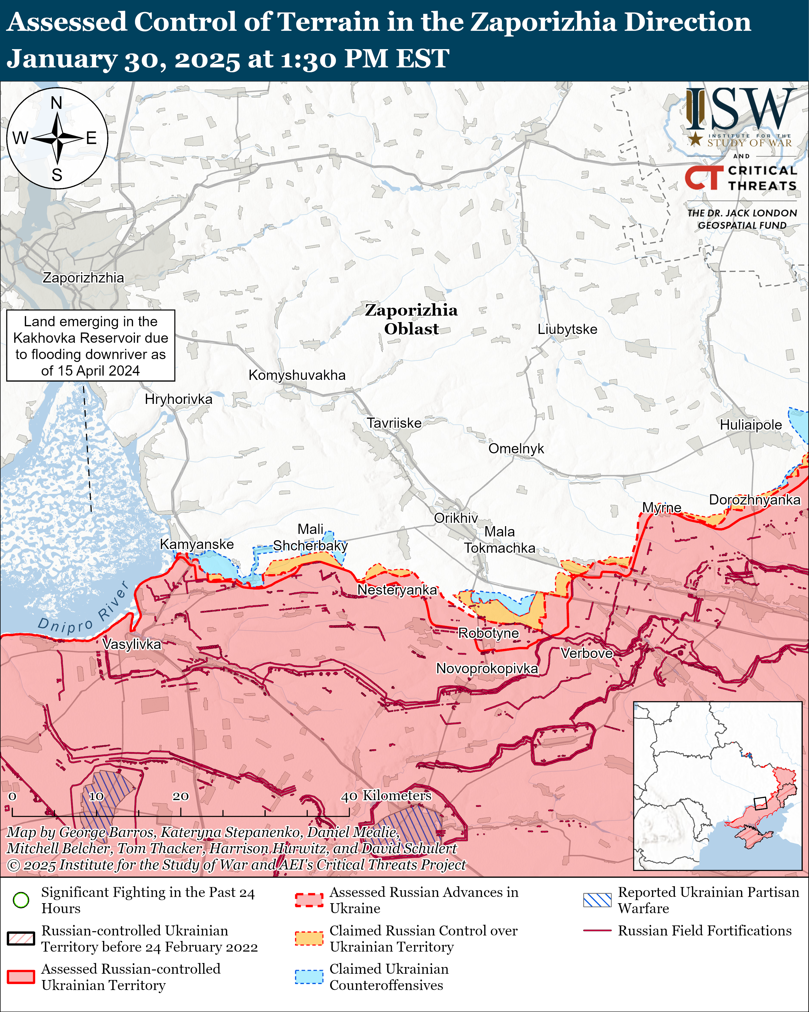 30 січня російські війська продовжували атакувати західну Запорізьку область. 29 січня російський мілблогер заявив, що російські війська просунулися до вулиці Центральної в Кам’янському, проте це не підтверджено.
