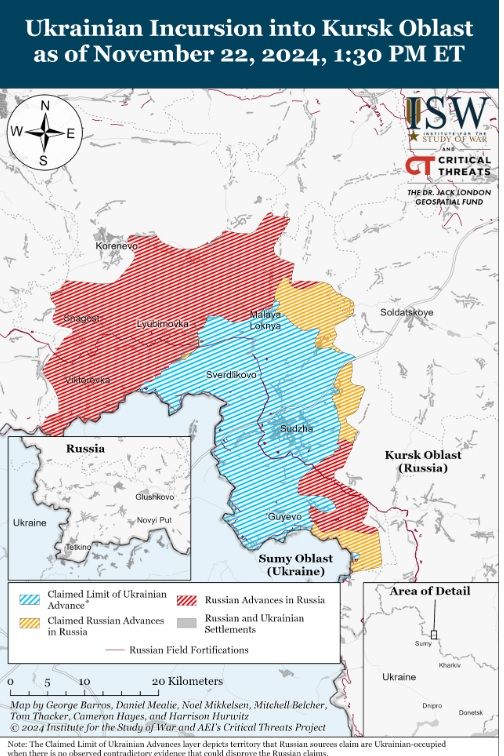 21 і 22 листопада російські війська продовжували штурм головного українського виступу в Курській області. Проте жодних успіхів підтверджено не було.