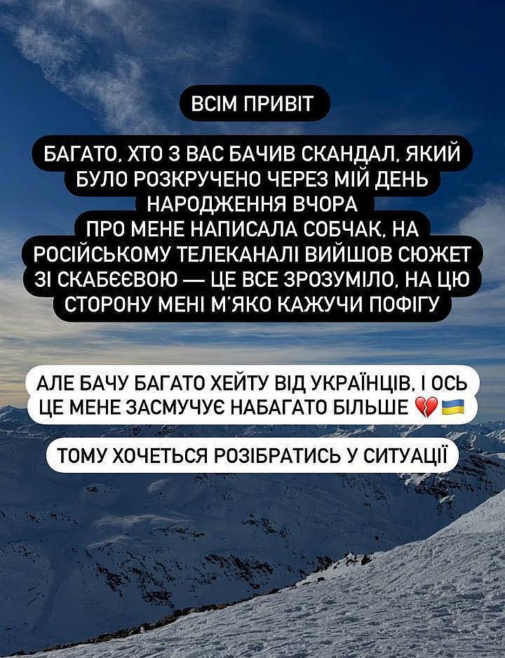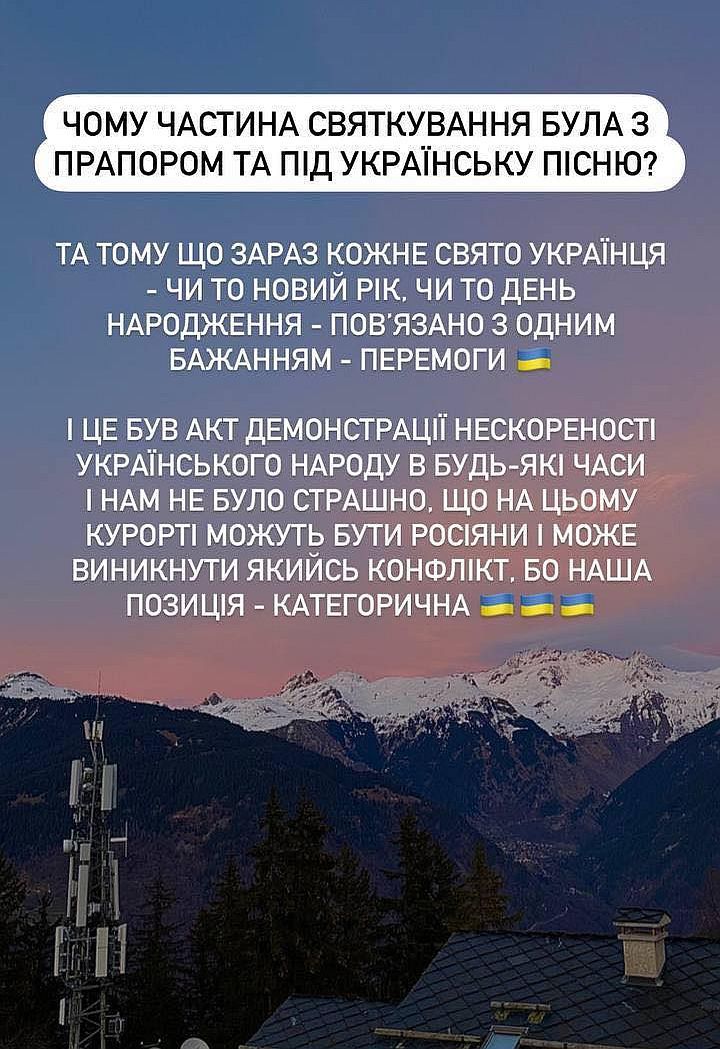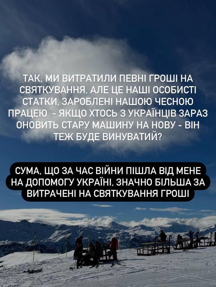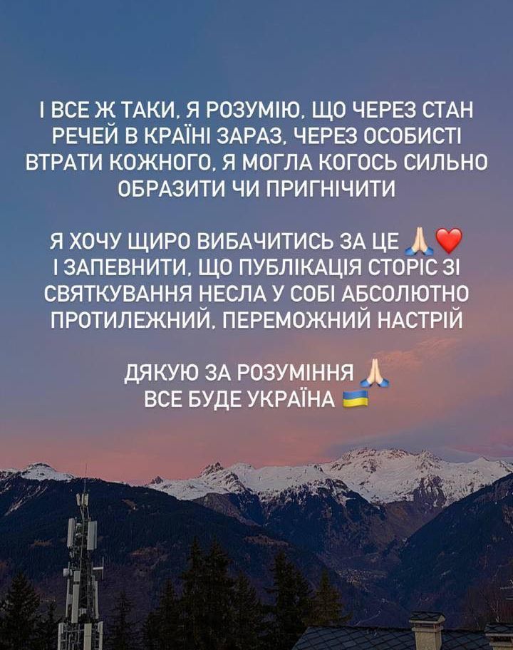 Я хочу щиро перепросити за це та запевнити, що публікація сторіс зі святкуванням мала абсолютно протилежний, переможний настрій. Дякую за розуміння. Все буде Україна!,