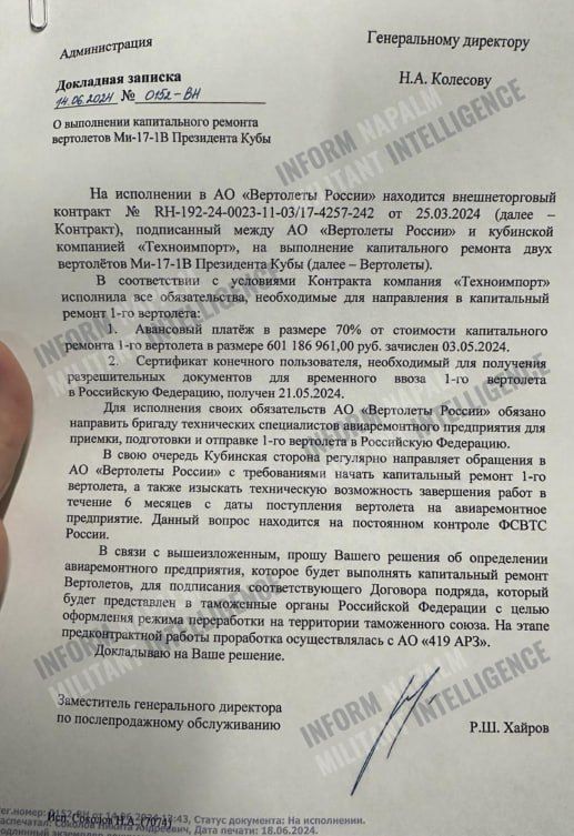 Йдеться про контракт із кубинською компанією "Техноимпорт" на капітальний ремонт двох гелікоптерів Мі-17-1В, що належать президенту Куби. Документи, які опинилися у розпорядженні InformNapalm і MILITANT INTELLIGENCE, свідчать: попри сплачений аванс у понад 600 мільйонів рублів, Росія не розпочала виконання угоди.
