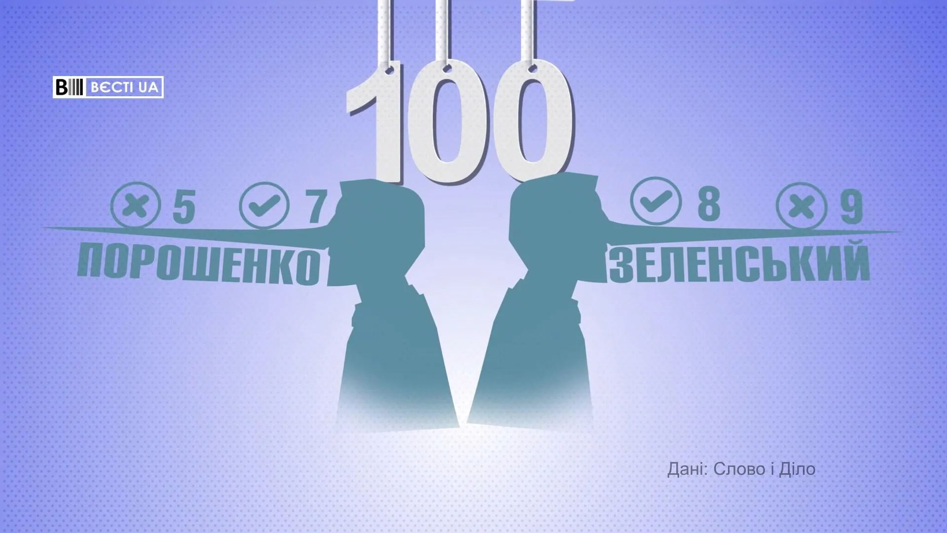 За 100 днів Володимир Зеленський виконав 8 обіцянок і провалив – 9, тоді як його попередник Порошенко виконав 7 і провалив 5.