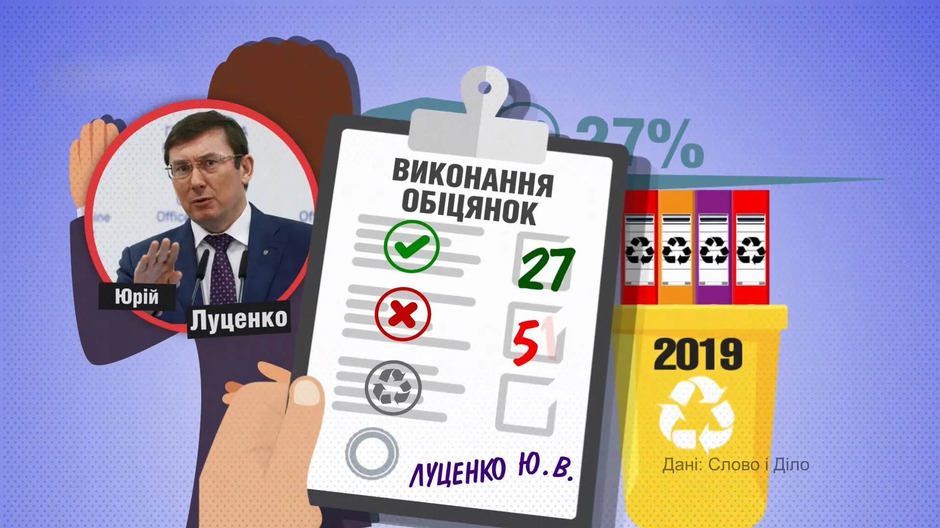 Тобто з 45 обіцянок він виконав 7 і провалив – 17. Ще 21, як він стверджує, у процесі виконання. Бездипломність Луценка найкраще проявилась на другий рік роботи. Тоді було виконано лише кожну восьму обіцянку, а це мізерні 13% від обіцяних.