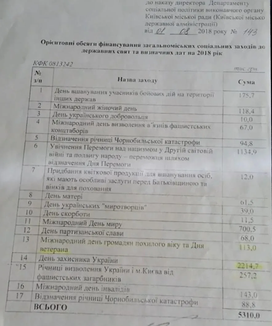Активістка Вікторія Губська надала журналістам документ про фінансування загальноміських соціальних заходів до державних свят та визначних дат на 2018 рік. Різноманіття заходів та кількість витрачених коштів може "різати" око багатьом українцям.