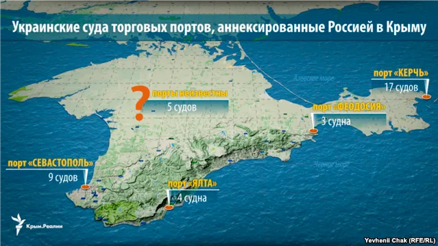 Понад три десятки суден, призначених для торговельних, пасажирських і вантажних цілей, а також судна спецпризначення і флоту обслуги присвоїла підконтрольна Росії кримська влада. Їх перелік опублікувало видання "Крим.Реалії".