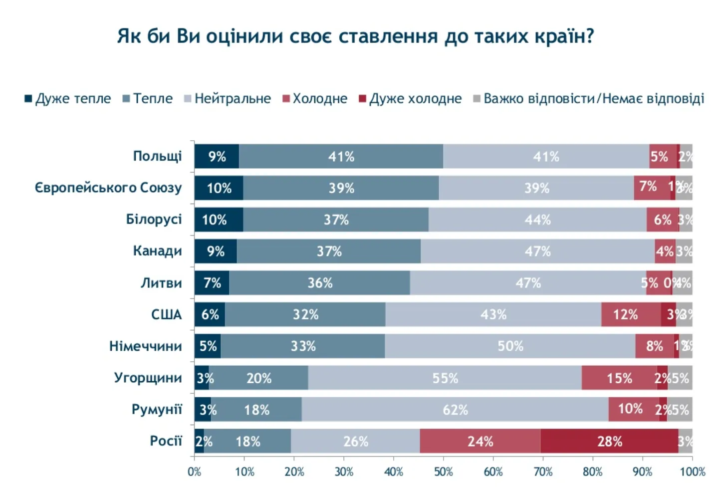 50% українців відчувають найтепліше ставлення до Польщі, до Європейського Союзу в цілому 49%, а до Білорусі 47%. "Холодно" або "дуже холодно" ставляться до цих країн мало опитаних українців – Польща (5%), ЄС (8%), Білорусь (6%).