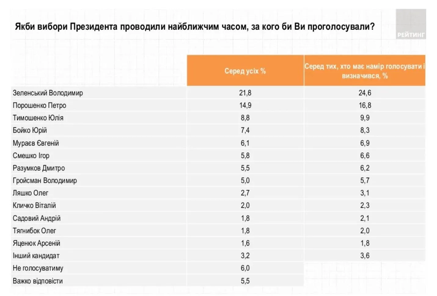 - Володимир Зеленський – 24,6% з тих, хто візьме участь у виборах і визначився, за кого голосуватиме;