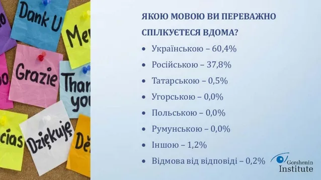60,4% українців, які взяли участь в опитуванні, зізнались, що вдома переважно спілкуються українською мовою, натомість 37,8% – російською, іншими мовами – 1,6%.