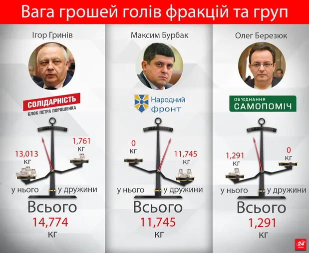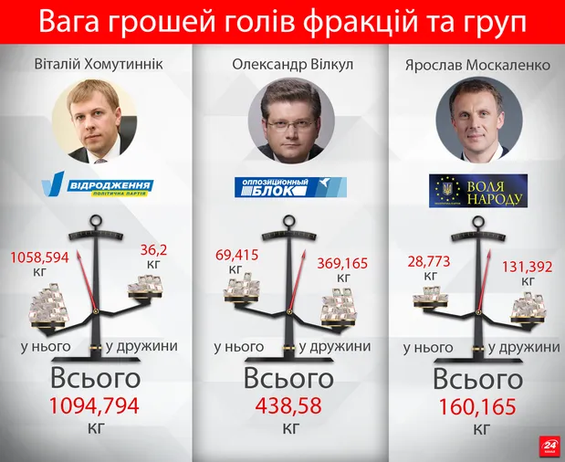 Абсолютний рекордсмен – голова депутатської групи "Відродження", народний депутат Віталій Хомутиннік задекларував 1058,594 кілограми готівки. А його дружина лише 36,2 кг.
