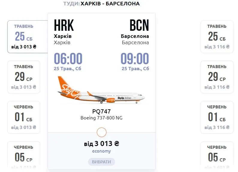 Рейс Харків – Барселона також буде виконуватися з 25 травня щосереди та щосуботи. Ціни стартують від 3013 гривень в один бік.