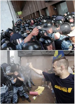 На другому фото видно, як хлопець у футболці ВО "Свобода" розпилює сльозогінний газ на бійців "Беркуту".