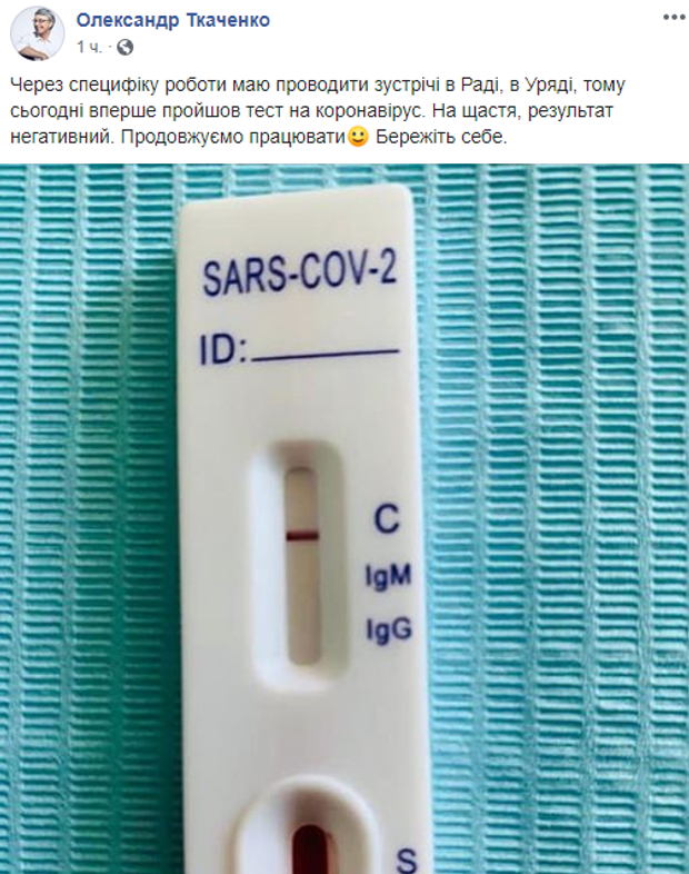 "Через специфіку роботи маю проводити зустрічі в Раді, в уряді, тому сьогодні вперше пройшов тест на коронавірус. На щастя, результат – негативний. Продовжуємо працювати. Бережіть себе", – зауважив він у новому повідомленні.