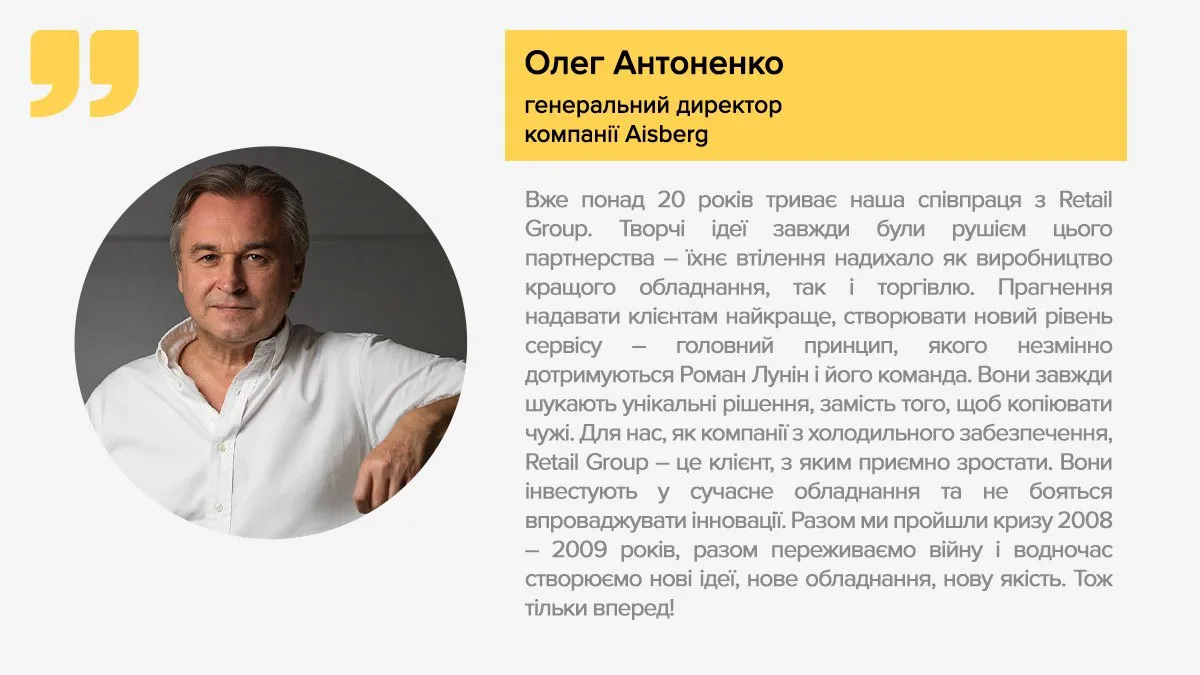 Як розповів генеральний директор компанії Aisberg Олег Антоненко, творчі ідеї завжди були основою партнерства з Retail Group, і їхнє втілення надихало на розвиток виробництва та торгівлі.