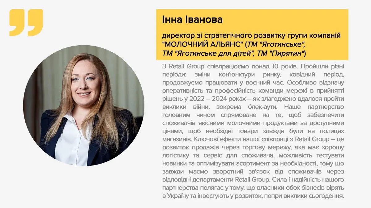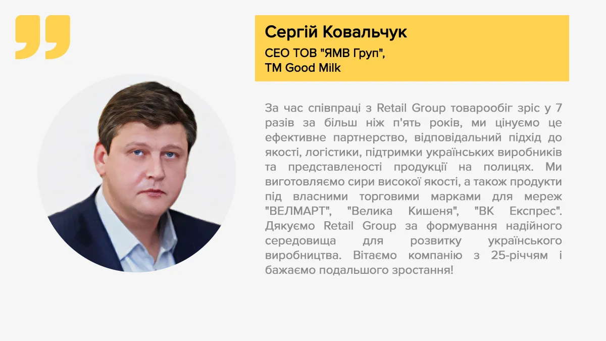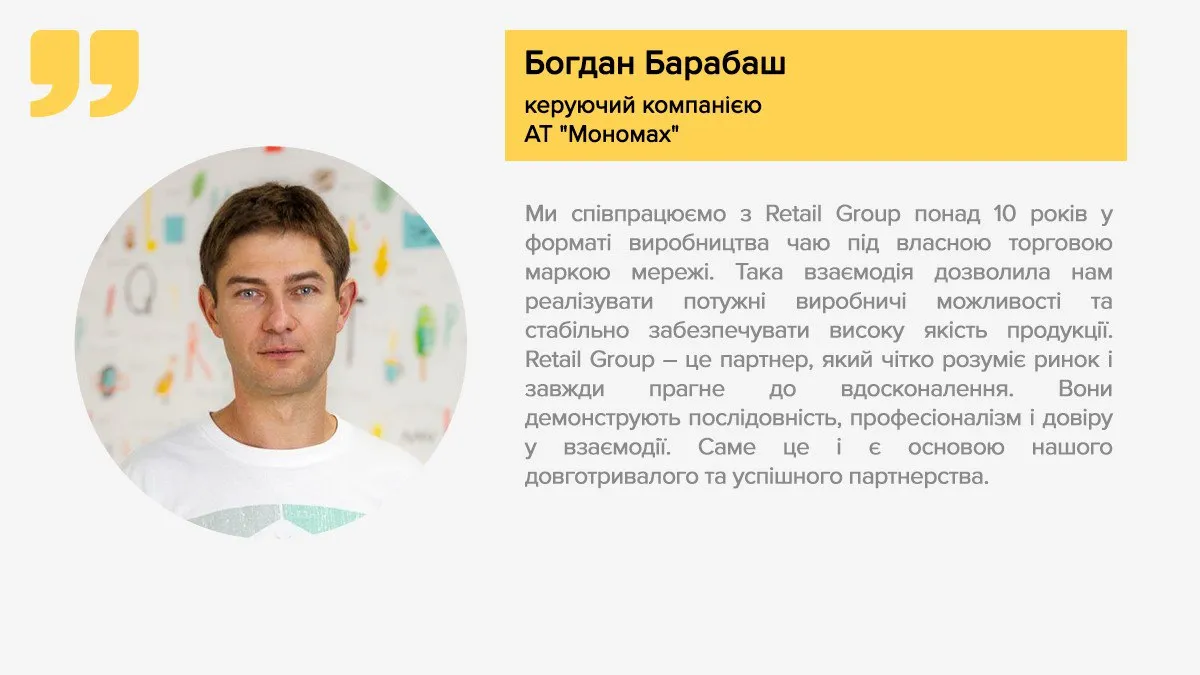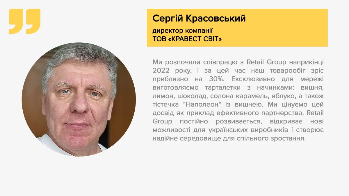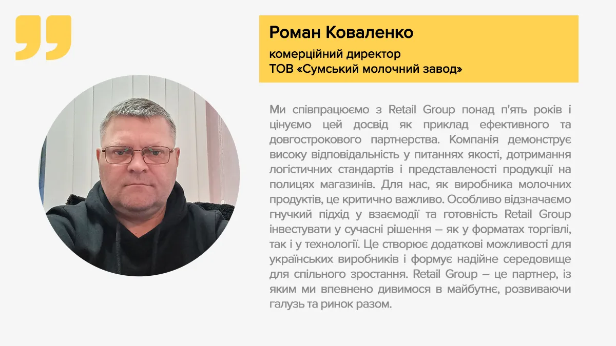 Якість, дотримання стандартів логістики та представленості продукції на полицях магазинів – це фундаментальні цінності Retail Group, завдяки яким формуються довгострокові партнерства.