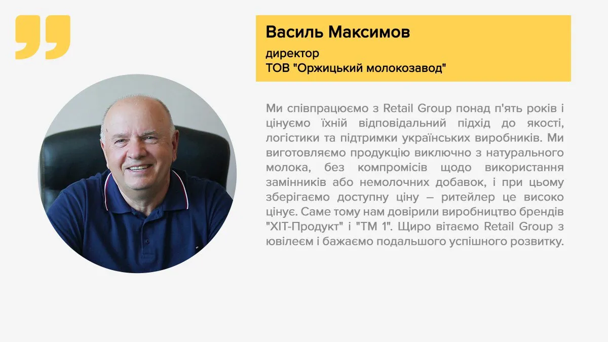 Зараз Retail Group співпрацює з понад 1200 вітчизняними компаніями. Понад 65% асортименту становлять товари українських виробників.