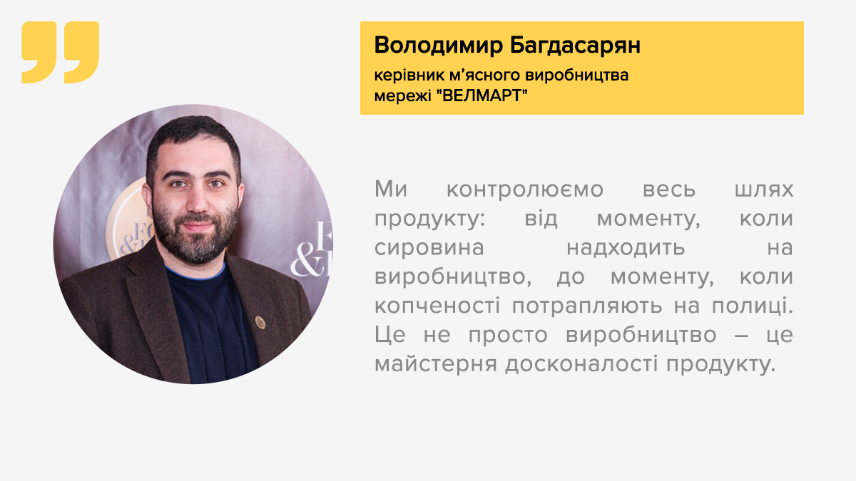 Що шукають українці, коли обирають копчене м'ясо? Аромат та якість, яка випробувана часом та гарантована виробником. "ВЕЛМАРТ" глибоко розуміє цей запит, тому кілька років тому почав активно розвивати власне м'ясне виробництво.