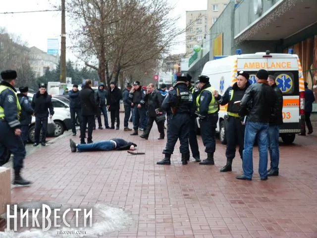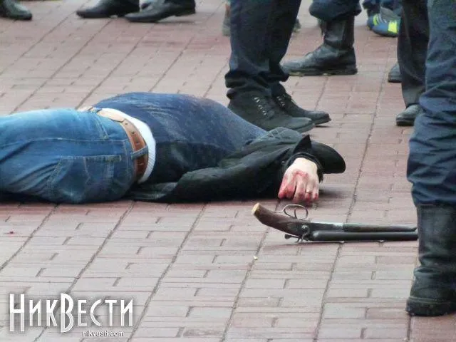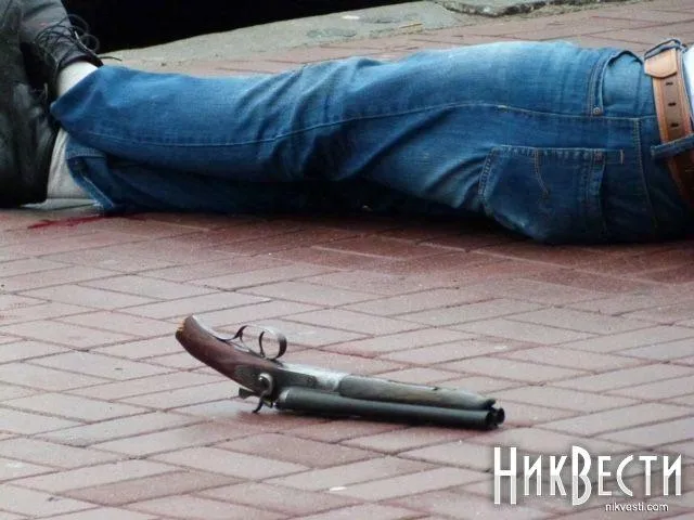 Як повідомили у миколаївській міліції, зі слів свідків події, невідомий чоловік вийшов із легкового автомобіля, вистрелив з обрізу у напрямку іншого чоловіка, який залишився в салоні машини, після чого вистрілив у себе.
