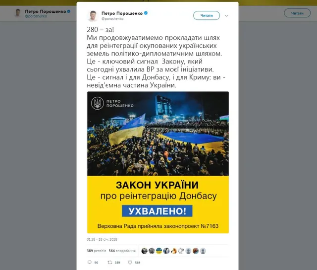 Читайте також: Це сигнал для Донбасу і Криму, – Порошенко щодо закону про реінтеграцію Донбасу