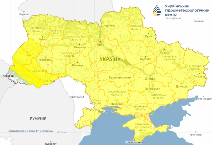 Області, у яких оголошено жовтий рівень небезпечності / Фото Укргідрометцентр