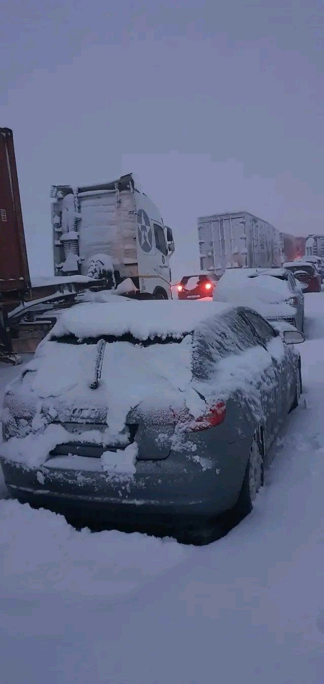 На дорогах утворилися величезні затори. Через снігопад рух заблокований. Люди застрягли в автомобілях.