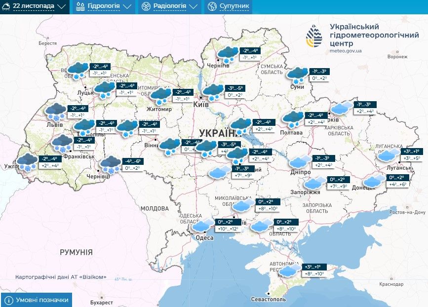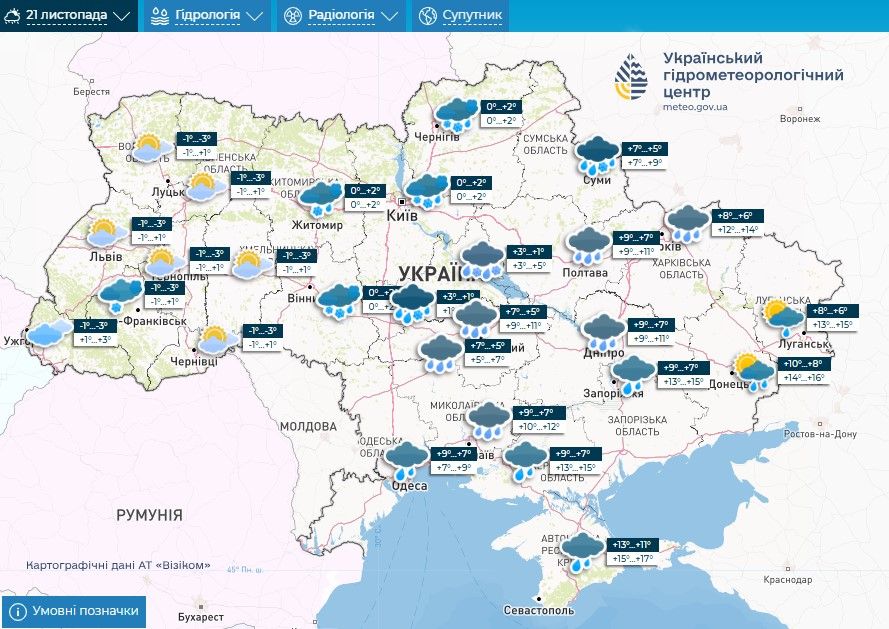 Прогноз погоди на 21 – 23 листопада / Скриншоти з Укргідрометцентру