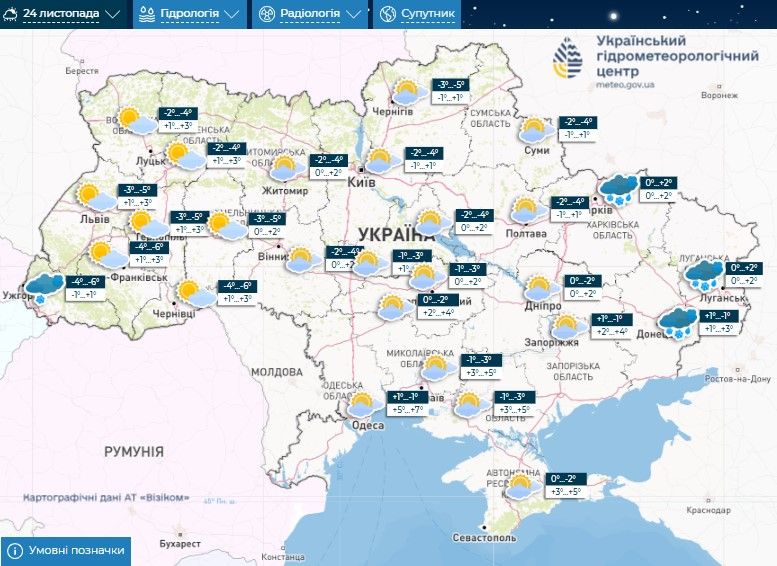 Прогноз погоди на 24 – 26 листопада / Скриншоти з Укргідрометцентру