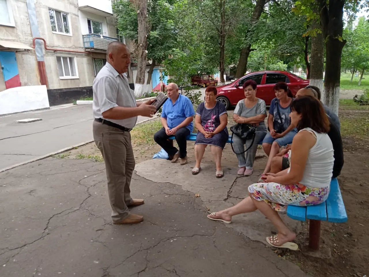 Виступ ситого "чиновника" перед людьми на лавочці – типовий приклад роботи "адміністрації" з громадянами. Але жодних проблем людей це не вирішує / Фото з дампа відділу внутрішньої політики окупаційної адміністрації Сніжного