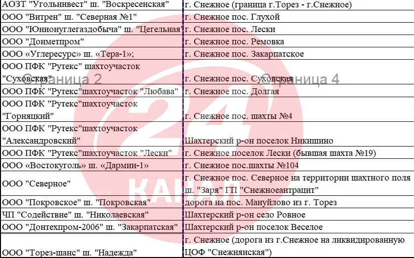 Приватні шахти Сніжного до окупації / Скриншот документа джерел 24 Каналу