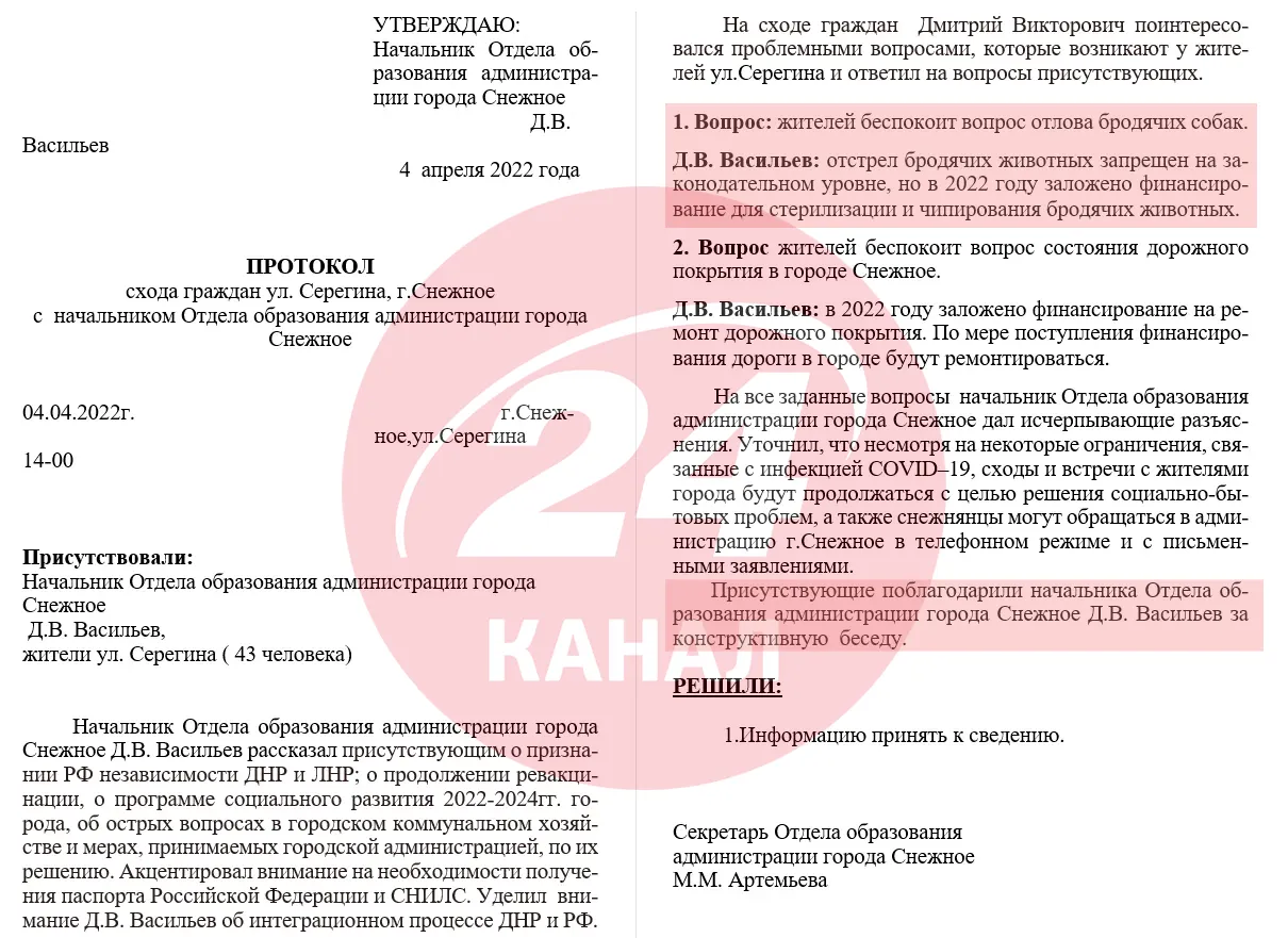 Подібні виїзди "посадовців" до жителів селищ та мікрорайонів міста з 2022 року провели незлічену кількість разів. Судячи з графіків, які колаборанти подавали своєму керівництву, "сходи" проводили приблизно раз на 2 – 3 дні. Кожного разу, коли люди зверталися до "депутатів" чи голів "адміністрації" з того чи іншого питання, їм розповідали про те, що фінансування вже закладено, інформацію беруть до уваги, а проблема ось-ось буде вирішена.