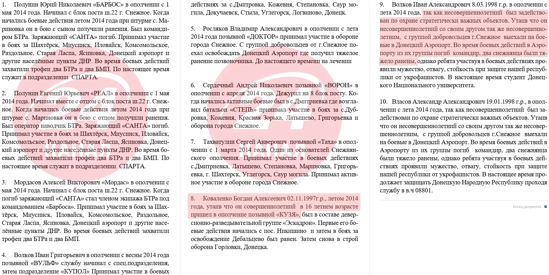 Росіяни та колаборанти геть не приховували участі підлітків у війні проти України / Документ із дампа відділу внутрішньої політики окупаційної адміністрації Сніжного за 2018 рік
