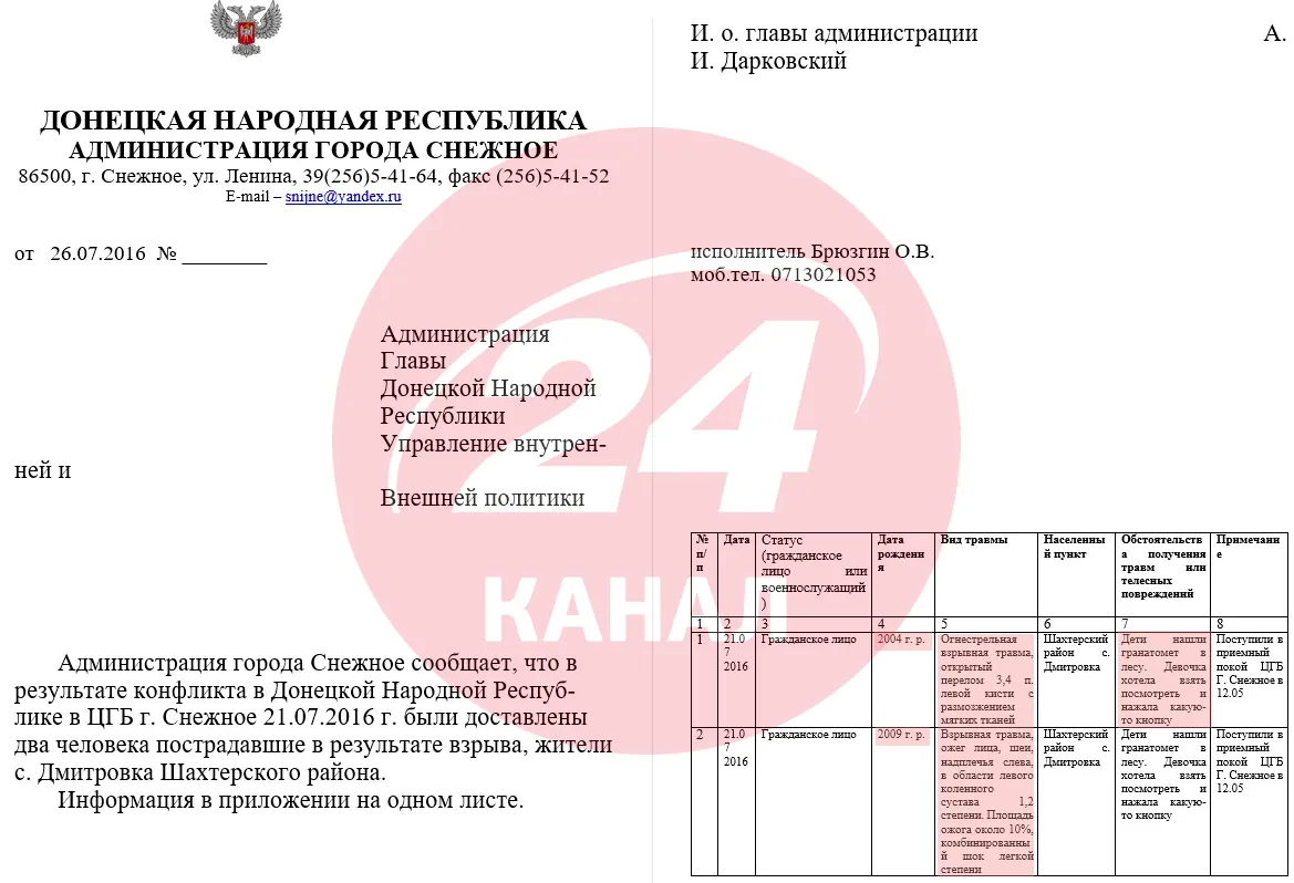 7-річна дівчинка та 12-річний хлопчик постраждали від ініціації гранатомета у Сніжному / Документ із дампа відділу внутрішньої політики окупаційної адміністрації Сніжного за 2016 рік