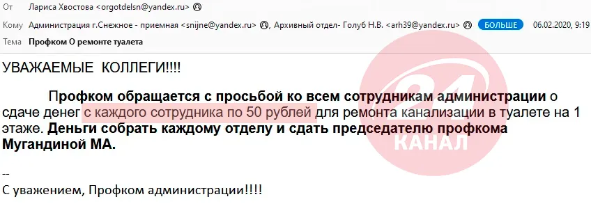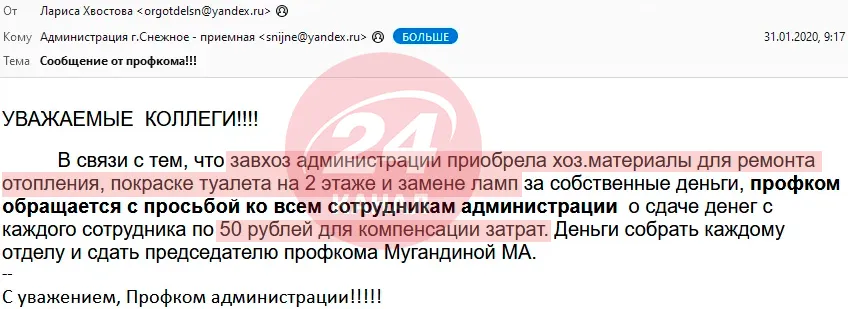 Тільки стіни пофарбували, як каналізація зламалася / Скриншот листа з дампа відділу внутрішньої політики окупаційної адміністрації Сніжного