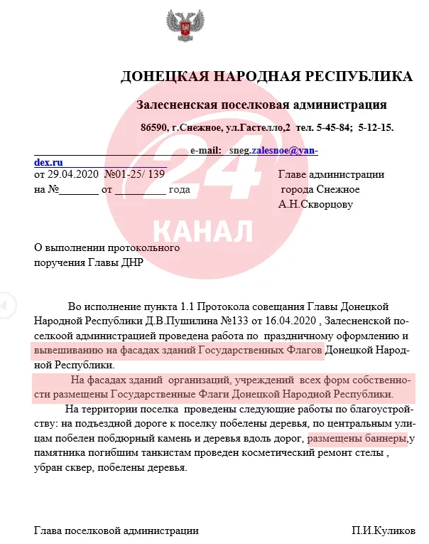 Без прапорів та банерів ніхто не знатиме, що "республіка" живе хорошо / Документ із дампа відділу внутрішньої політики окупаційної адміністрації Сніжного за 2020 рік