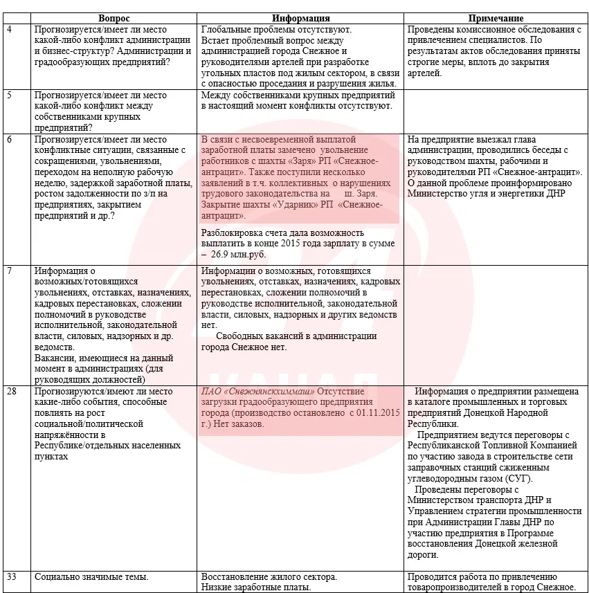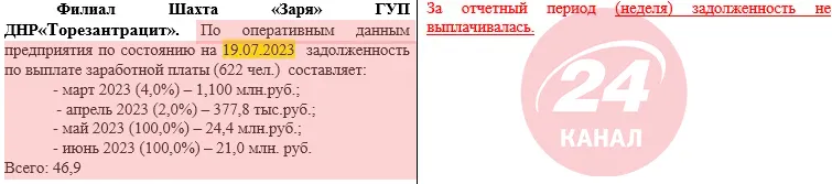 Так, у звіті про проблеми міста за 16 січня 2016 року, "посадовці" вказали, що з шахти "Зоря" через відсутність зарплат масово звільняються працівники. При цьому наприкінці 2015 року гірникам виплатили частину грошей – майже 27 мільйонів рублів. Втім, ця сума геть не покрила зобов'язань підприємства перед штатом.