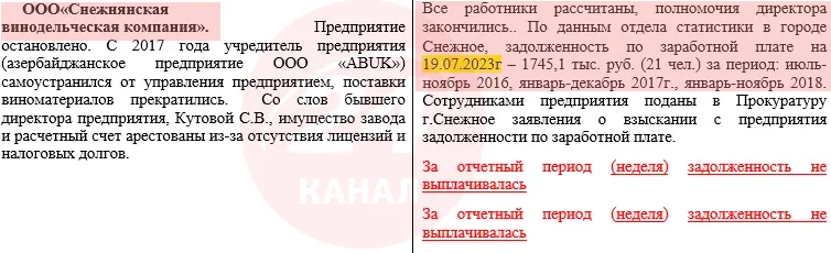 Доля виноробного заводу була вирішена, як тільки у Сніжному зірвали український прапор / Скриншот документа з дампа відділу внутрішньої політики окупаційної адміністрації Сніжного